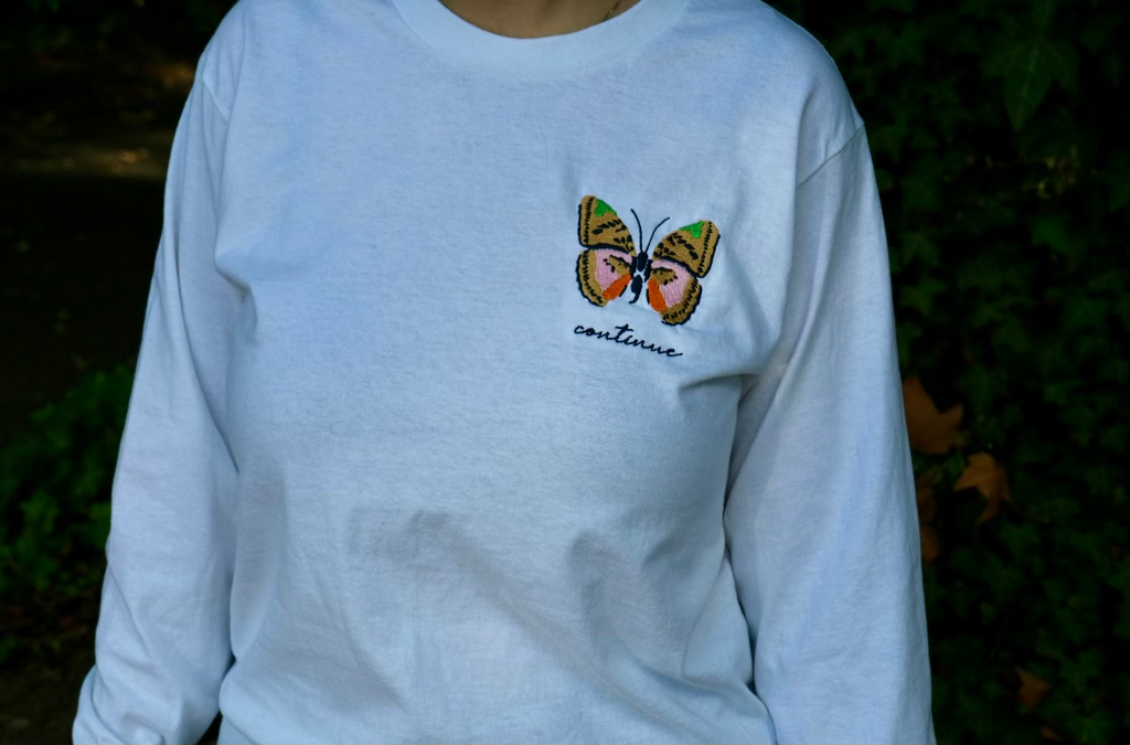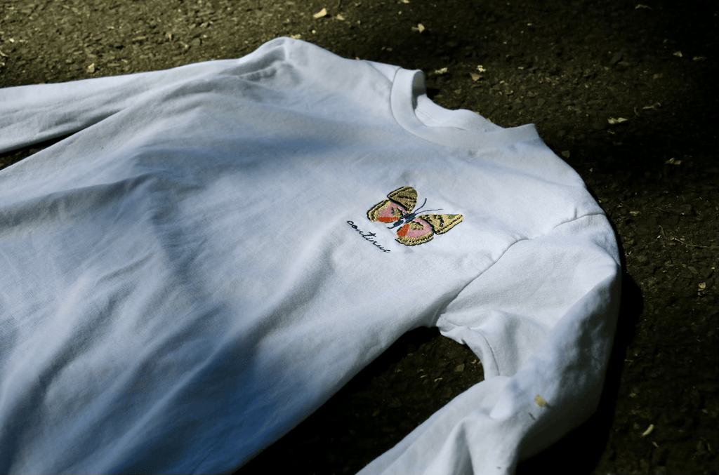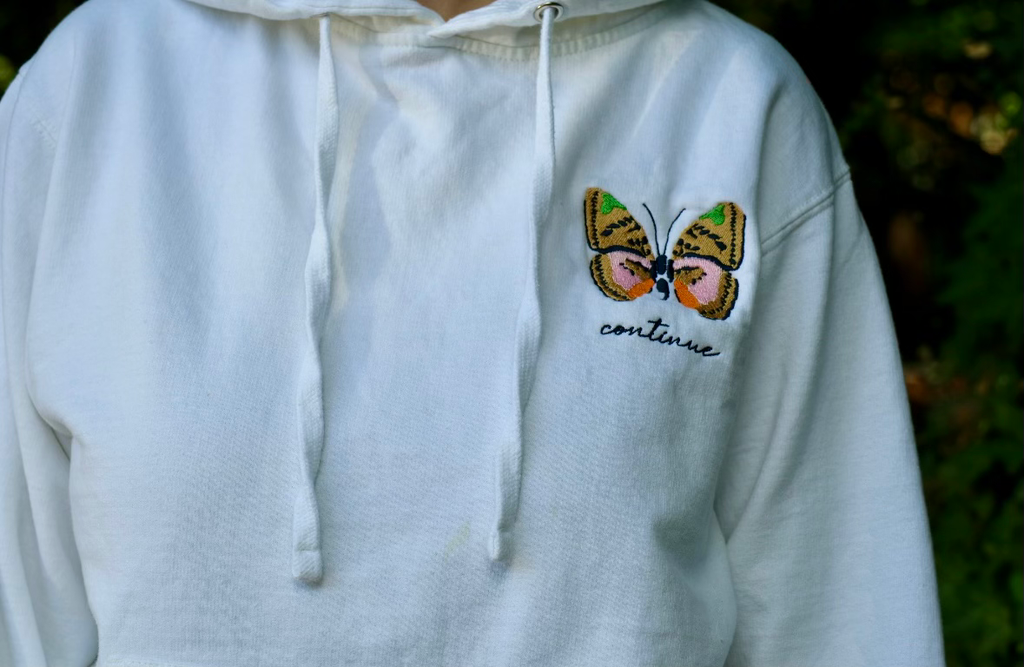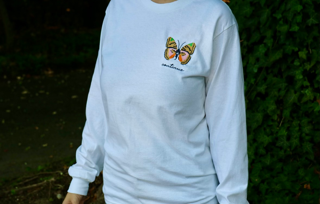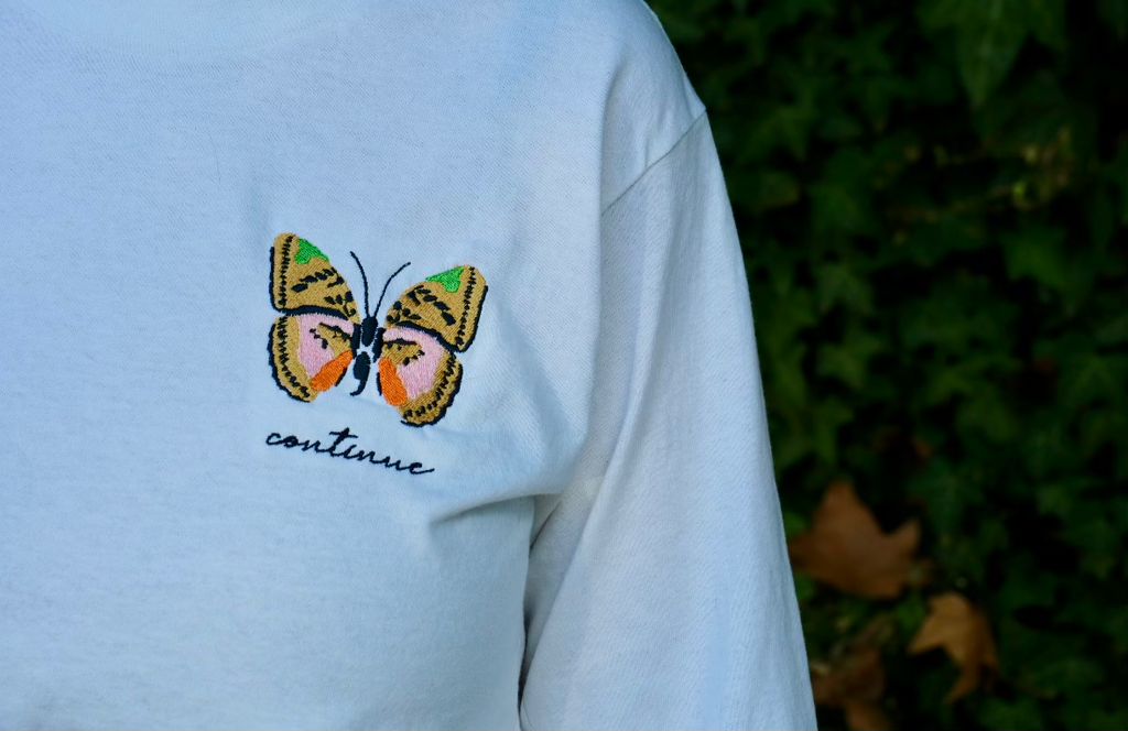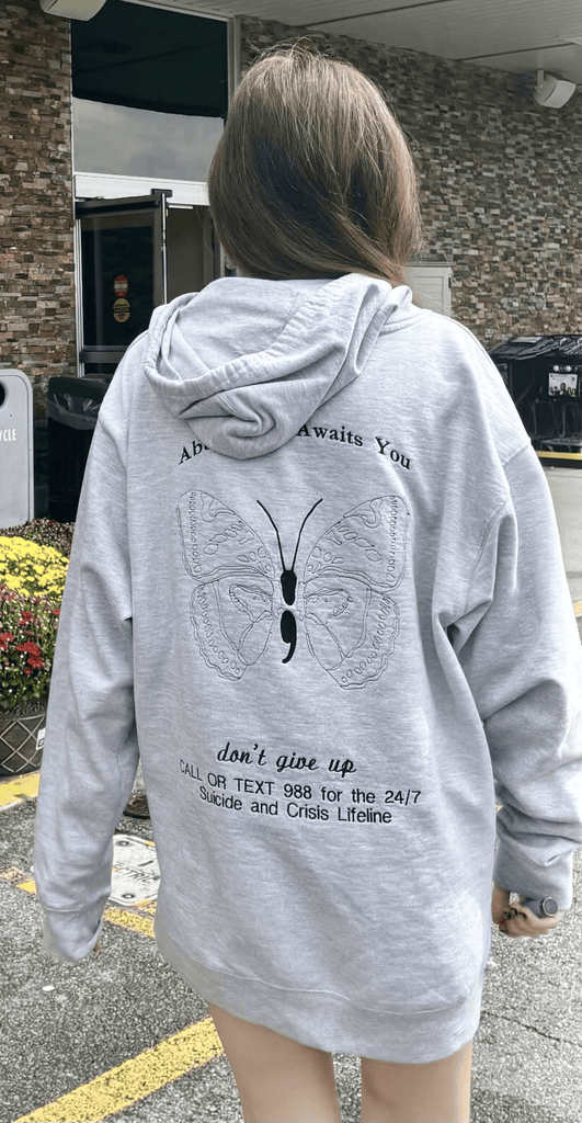 Each of these articles of clothing are designed with intention, featuring an embroidered front and a butterfly with mental health & suicide prevention resources printed on the back. By wearing it, you not only honor Kelly’s life but also help spread awareness in your own community.